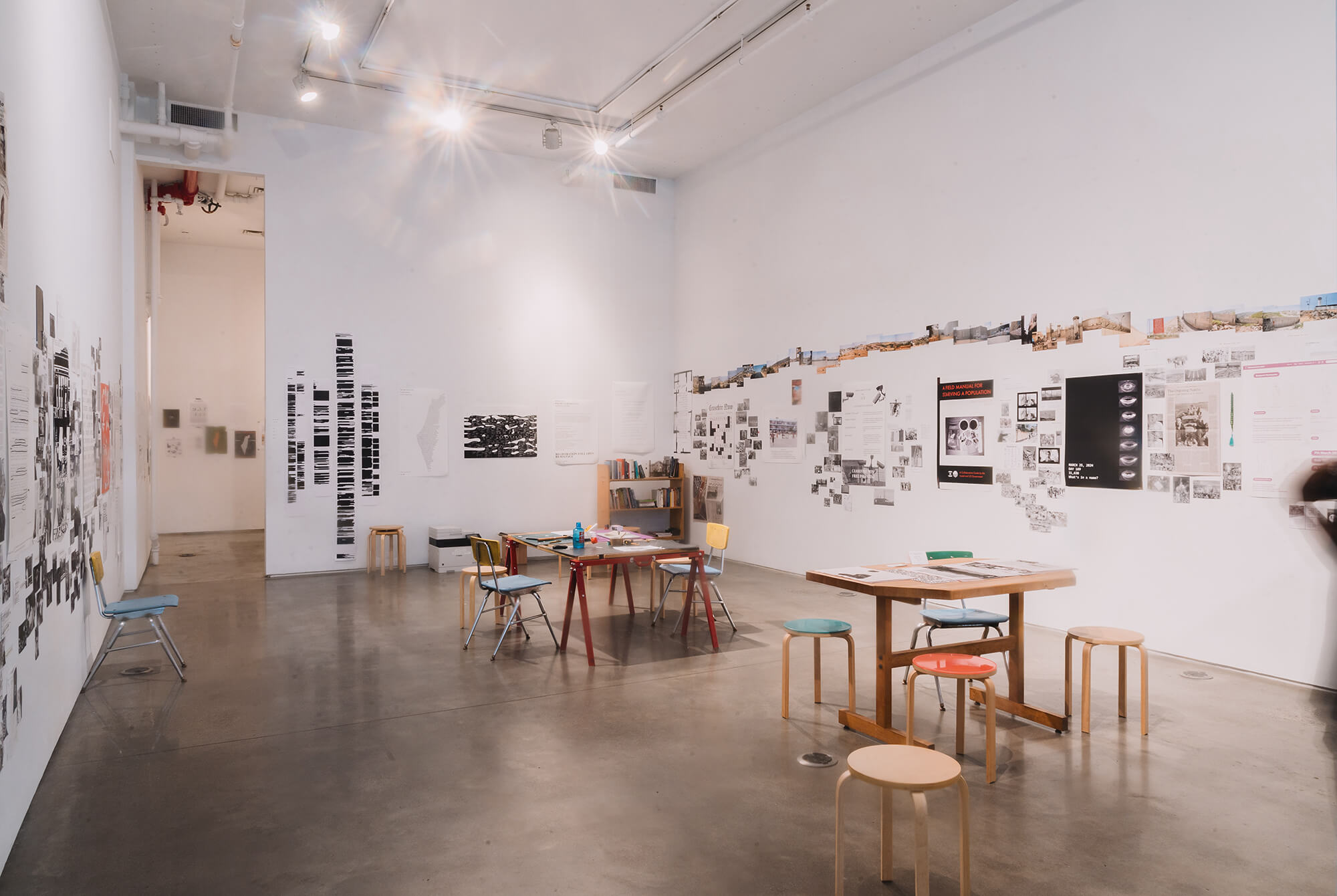 La gran sala de a83 muestra una cronología de la colonización de Palestina por las fuerzas británicas, israelíes y estadounidenses. También presenta un gráfico de tiempo en forma de espiral que revela la relación de la Universidad de Columbia con el colonialismo. Acompañada de carteles litografiados con poesía de June Jordan y texto de Edward Said, se trata de una «biblioteca del pueblo» llena de libros anticoloniales y otros objetos que cuentan colectivamente la historia Una historia de resistencia y liberación.