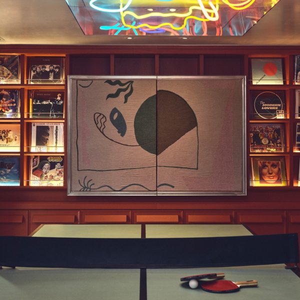 un devanado neón La sala de escucha de vinilos cuenta con luces de techo y está diseñada como un «rincón privado reflectante». El espacio presenta pilas de registros exhibidos en estantes abiertos de color rojo sangre.