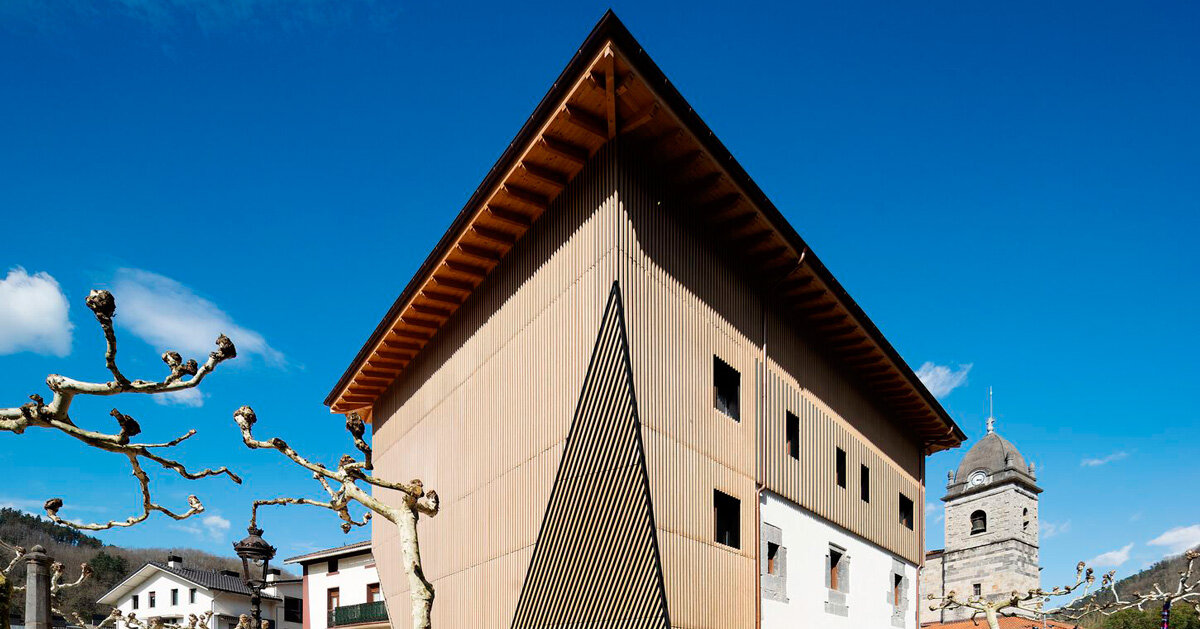Listones de madera verticales en la fachada poliédrica del Ayuntamiento de Iluca, España