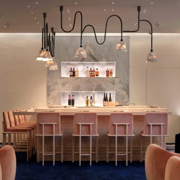 «El color coral de la pared de William Ceramics fue la primera opción, seguido de la madera clara de la barra, y finalmente elegí el mármol Versylis», dice Bonnell.