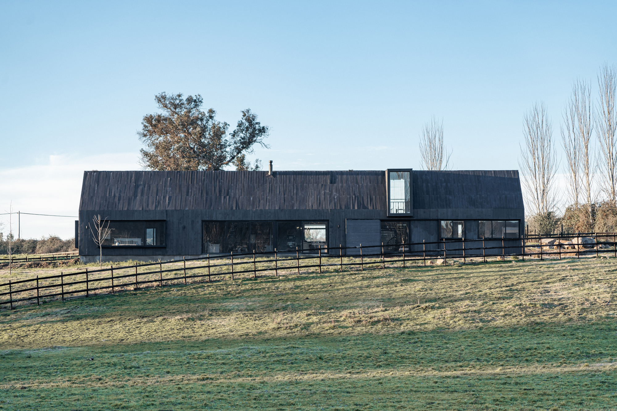 Descripción textual proporcionada por el arquitecto. La casa Botafogo está ubicada en una colina, al lado de un criadero de caballos y entre nogales. RomeralRegión del Maule, Chile. La casa, construida íntegramente en madera, se inspiró en antiguas chozas del sur de Chile, adaptándose a las necesidades de la vida contemporánea y los requerimientos del cliente. Más allá de eso, debe ser a la vez acogedor y funcional, capaz de albergar a una persona y, a veces, a una familia con hijos y nietos.