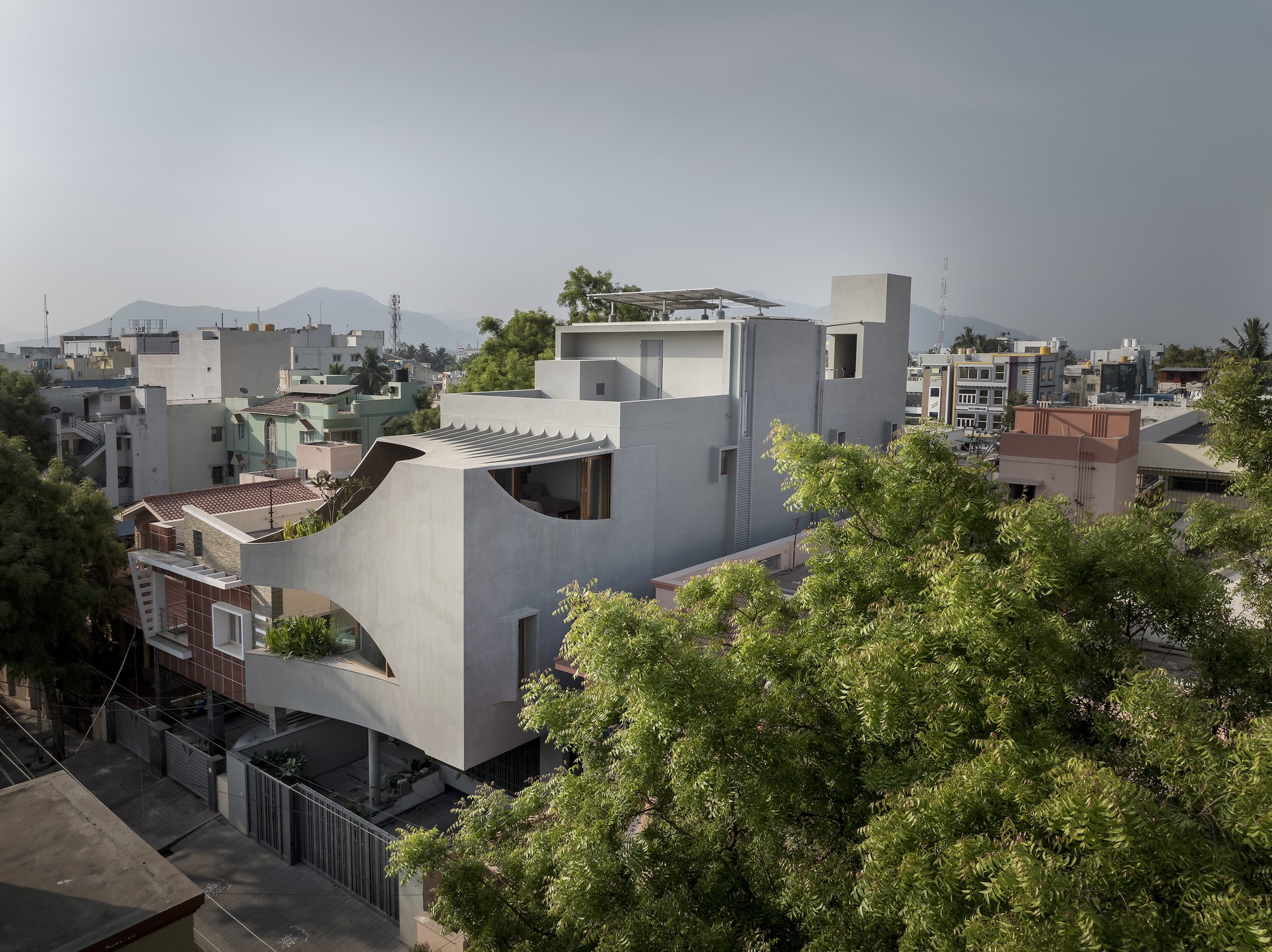 Descripción textual proporcionada por el arquitecto. «K Home» se alza entre las montañas krishnagiri En una zona residencial muy transitada. La fachada recuerda a un cubo con secciones estratégicamente excavadas, creando aberturas dinámicas que enmarcan la ciudad y las colinas más allá.