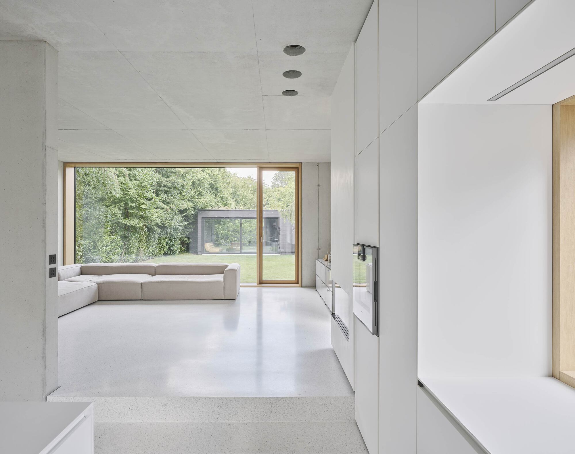 Para evitar el sobrecalentamiento, las grandes superficies acristaladas de la fachada longitudinal están orientadas hacia el norte. Los ventanales y puertas interiores de roble contrastan con las superficies de hormigón en bruto y los suelos de terrazo pulido. La fachada oscura y uniforme envuelve visualmente las diferentes formas de ventanas.