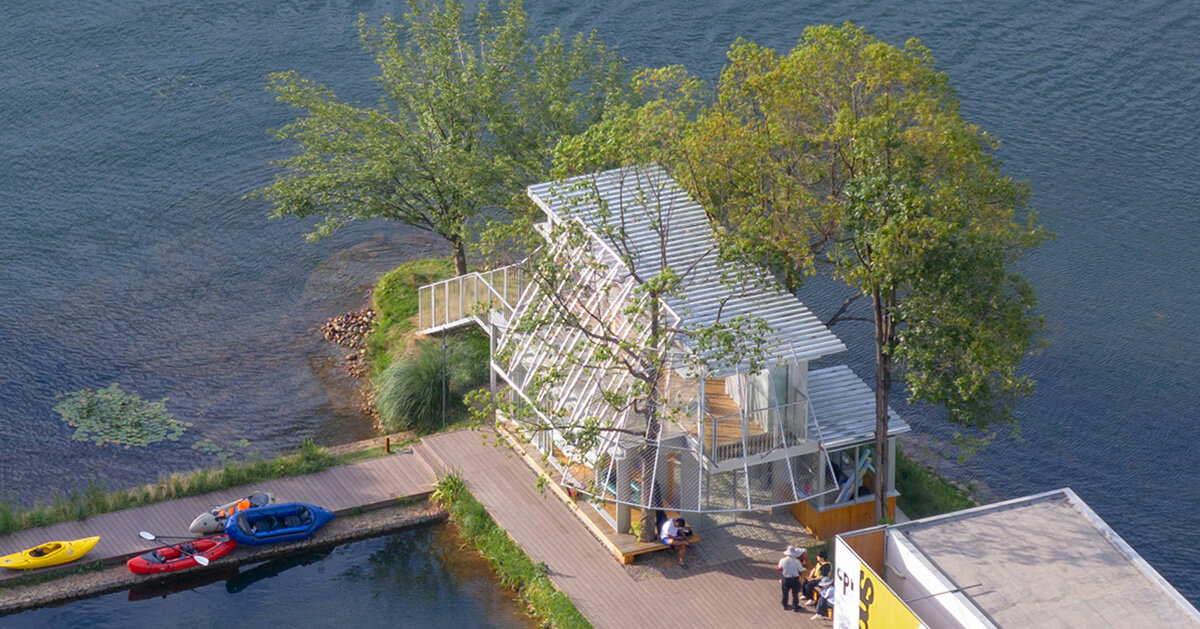 Los diseños de YIIIE Architects abordan cuestiones de sostenibilidad respondiendo a la brecha entre el rápido ritmo de los mensajes modernos y el lento ritmo del mundo físico. En el lado norte de CPI W-18b, una interfaz elevada con una pasarela circular garantiza la conexión visual manteniendo una sensación de independencia. El lado este, cerca del final de la isla, ofrece un espacio tranquilo enmarcado por escaleras, aleros y melocotoneros. Hacia el sur, una plataforma de hormigón en la orilla del lago proporciona un lugar privado para conversar y realizar posibles actividades como el mantenimiento del kayak. El lado oeste, que sirve como entrada, cuenta con un dosel de malla alrededor de los árboles que filtra los escombros y crea un área de sombra con un espacio de bar para apoyar las actividades al aire libre. Para hacer realidad estos ideales, Estudios de Chengdu y Tokio El uso de materiales estructurales livianos, como estructuras de acero de 100 × 100 metros, paneles solares y placas de acero reguladoras de presión, garantiza una construcción rápida y de bajo costo y cumple con los estándares de energía verde.