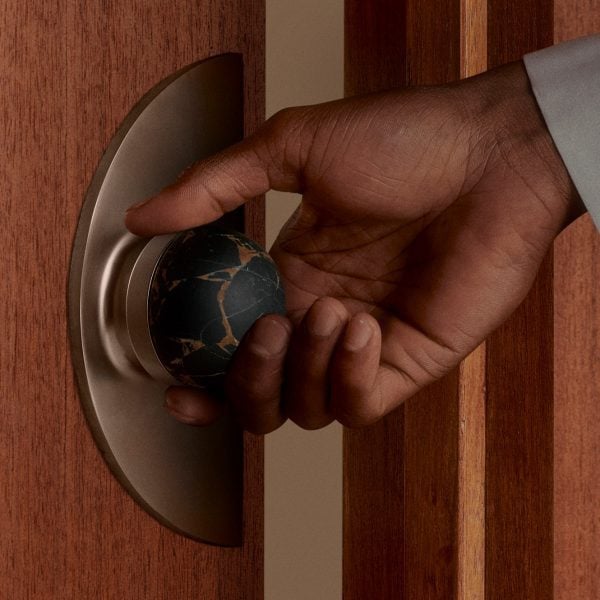 Sala de exposición Dezeen: escultural manija de la puerta compuesto por madera, Metal y piedra Es uno de los diez nuevos productos que se exhiben en la sala de exposición de Dezeen.