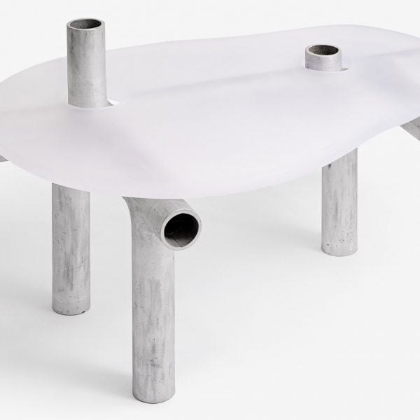 diseñador coreano Xu Zhenghua usado dedicado aluminio los tubos crean una serie de mesas y bancos, cuya estructura se esconde detrás del esmerilado fibra acrílica.