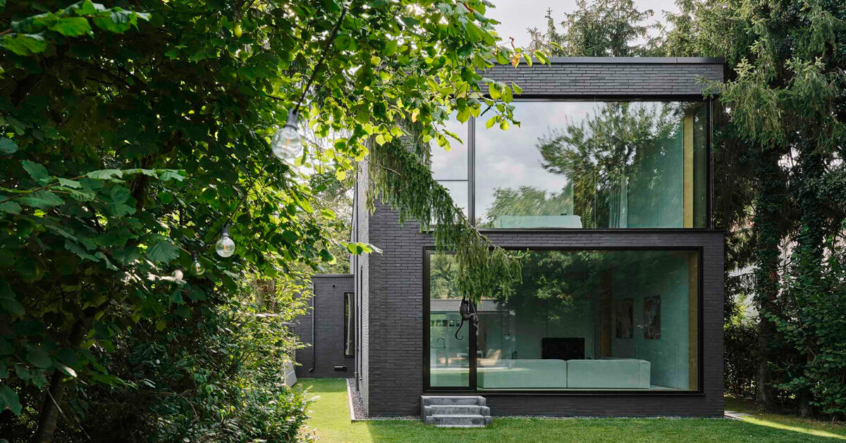 las aberturas de vidrio resaltan la fachada de ladrillo oscuro de la tiefes haus alemana