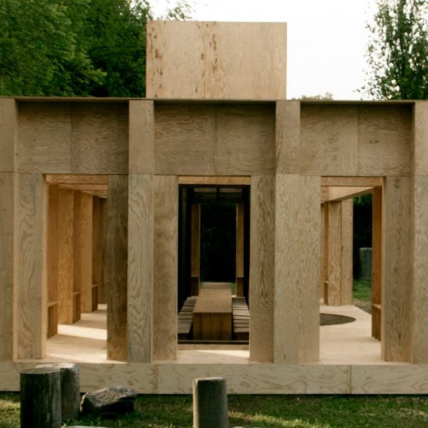 Fabricado íntegramente con paneles marinos con muescas. pino El pabellón está hecho de madera contrachapada y presenta una sala central rectangular rodeada por una columnata geométrica.