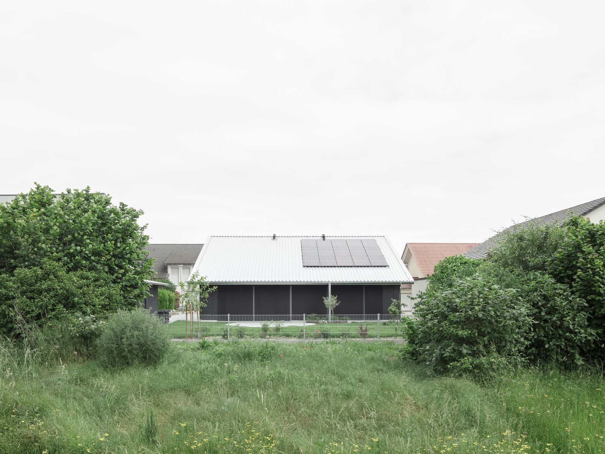 Descripción textual proporcionada por el arquitecto. El concepto arquitectónico «Cuadrado y círculo techado» es una casa de madera en el Palatinado Sur que se alza como un edificio independiente en un terreno al borde de un campo con una vista panorámica de Kalmit. El título lo puso el constructor de madera, que dijo: «Es sólo un cuadrado con techo», y al final así fue.