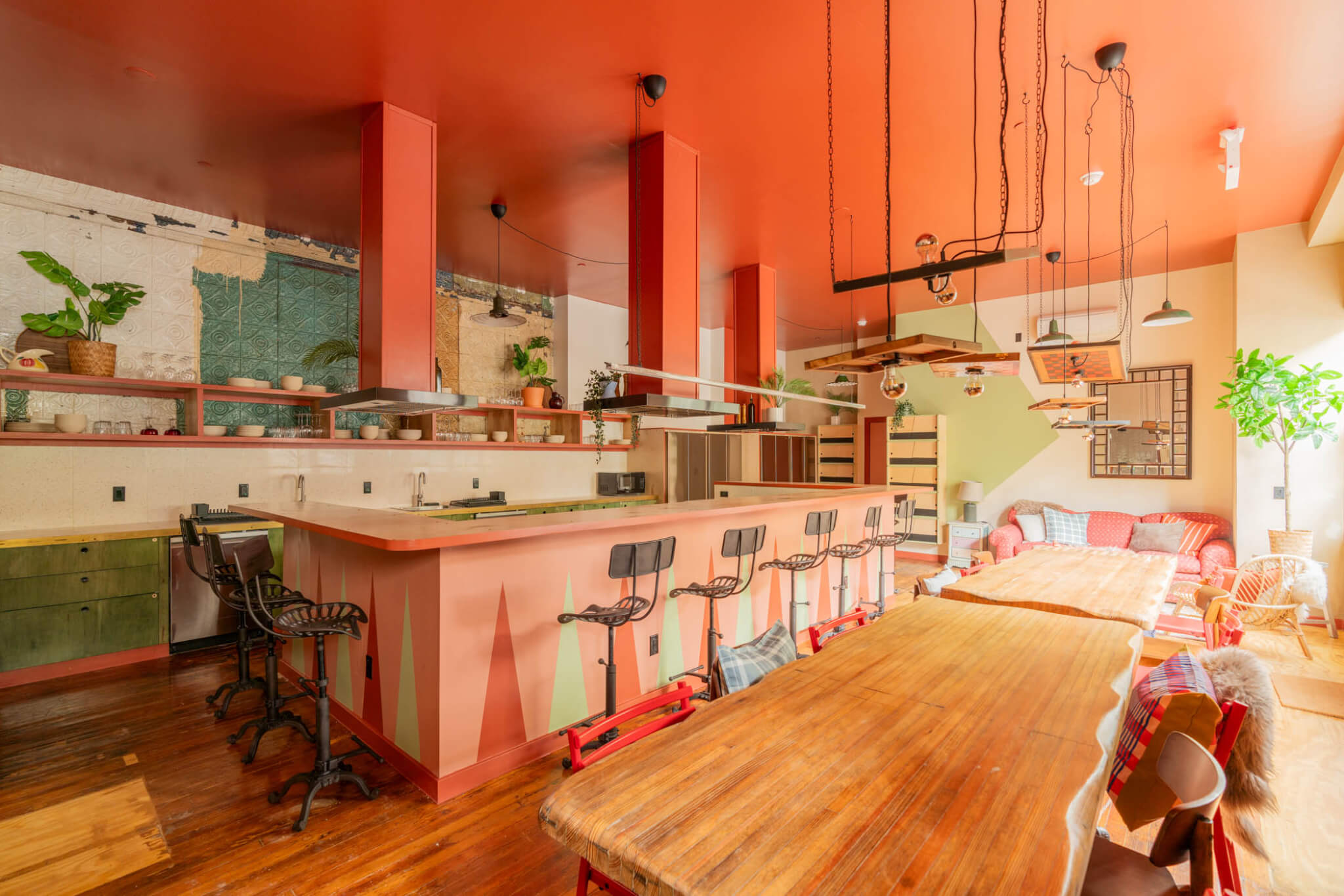 La comunidad es un principio clave de la filosofía de Cohabs, por lo que el primer piso suele ser comunitario. La cocina está totalmente equipada con utensilios de cocina y cubertería. Incluye una lujosa mesa de comedor y una pequeña zona de estar. Aquí se utiliza una combinación de colores atrevidos, con el techo y las rejillas de ventilación de la estufa completamente en rojo anaranjado quemado, que contrastan con los gabinetes de madera verdes. El sótano se convirtió en una gran sala de estar con un sofá hundido y extravagantes sillas laterales donde la gente puede socializar. A pesar de ser un sótano, con algunas paredes de piedra vista, es fácil olvidar que no hay ventanas. En cambio, una variedad de texturas y patrones chocan entre sí. Desde muebles intencionalmente que no combinan hasta más parafernalia de juegos de mesa, el espacio continúa con el ambiente informal que ha creado Cohabs.