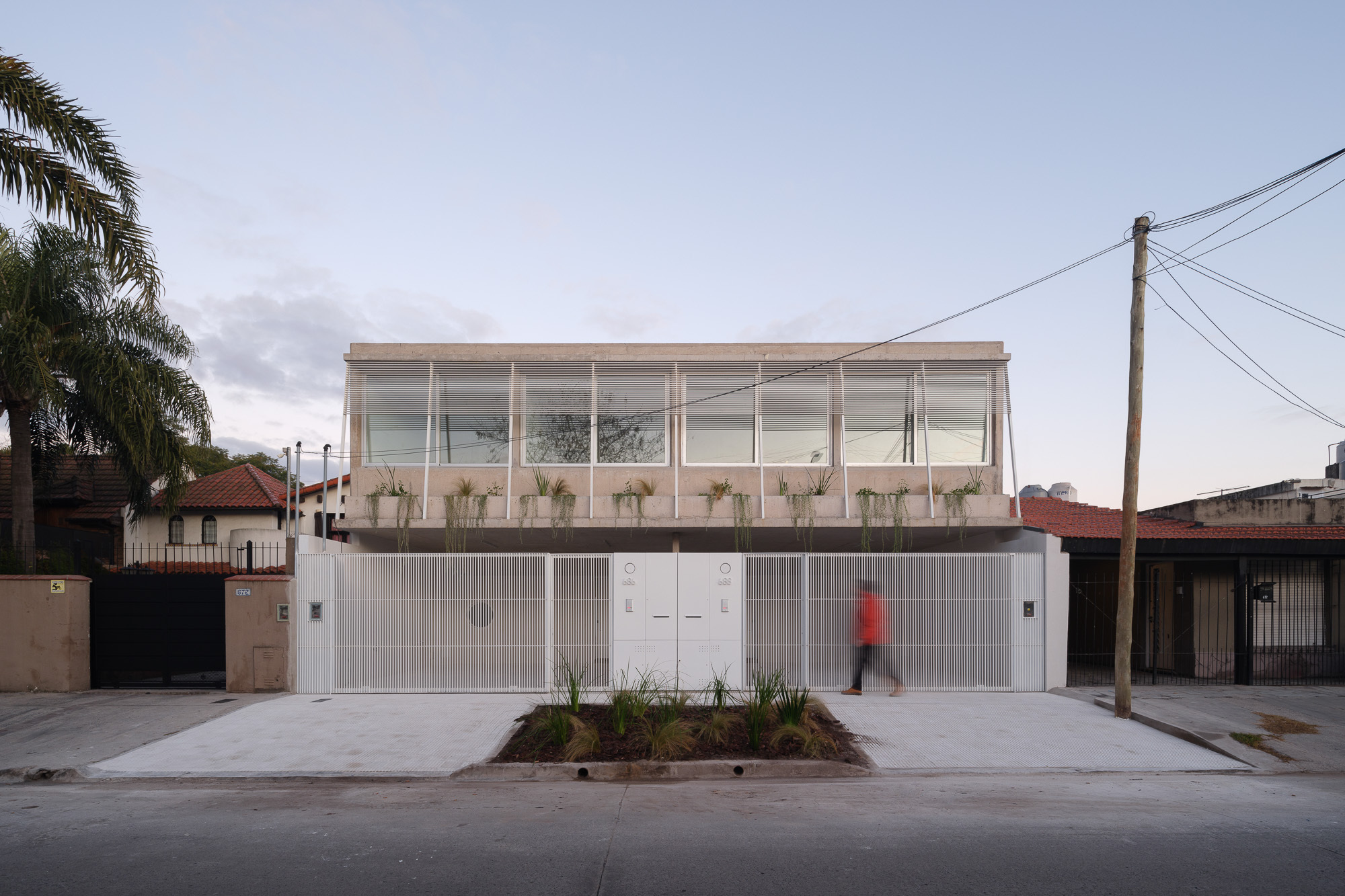 Descripción textual proporcionada por el arquitecto. El proyecto está ubicado en la zona residencial de Ituzaingó en el oeste de la provincia de Buenos Aires. Dos casas espejadas ubicadas en un terreno de 12×30 metros. Se encontraron patrones claros en el entorno circundante. La transición entre la calle y el interior de la casa se expresa a través de una serie de elementos inmutables: aceras, vallas, parterres, patios y puertas.