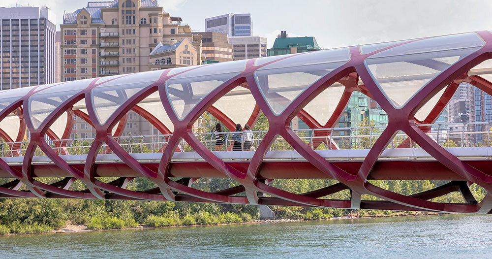 Fotografías recientes tomadas por fotógrafos de arquitectura. Danica Kus Ofreciendo una nueva perspectiva sobre el Puente de la Paz de Calatrava, muestra el arte perdurable del trabajo del arquitecto hispano-suizo. La lente de Coos captura las capas retorcidas de la estructura del puente y la combinación de vidrio y acero teñido de rosa, todo ello con el telón de fondo del paisaje urbano de Calgary. El Puente de la Paz es un ejemplo escultórico de cómo la arquitectura puede convertir la infraestructura urbana en una obra de arte.