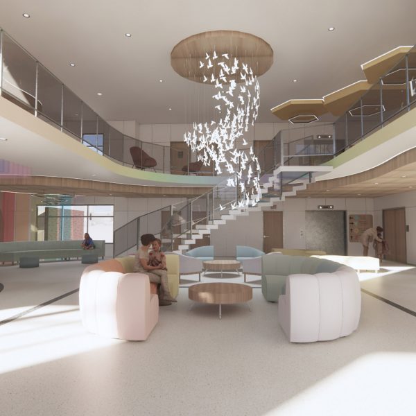 Visualización de la clínica en tonos blanco, marrón y arcoíris, con asientos por todas partes.