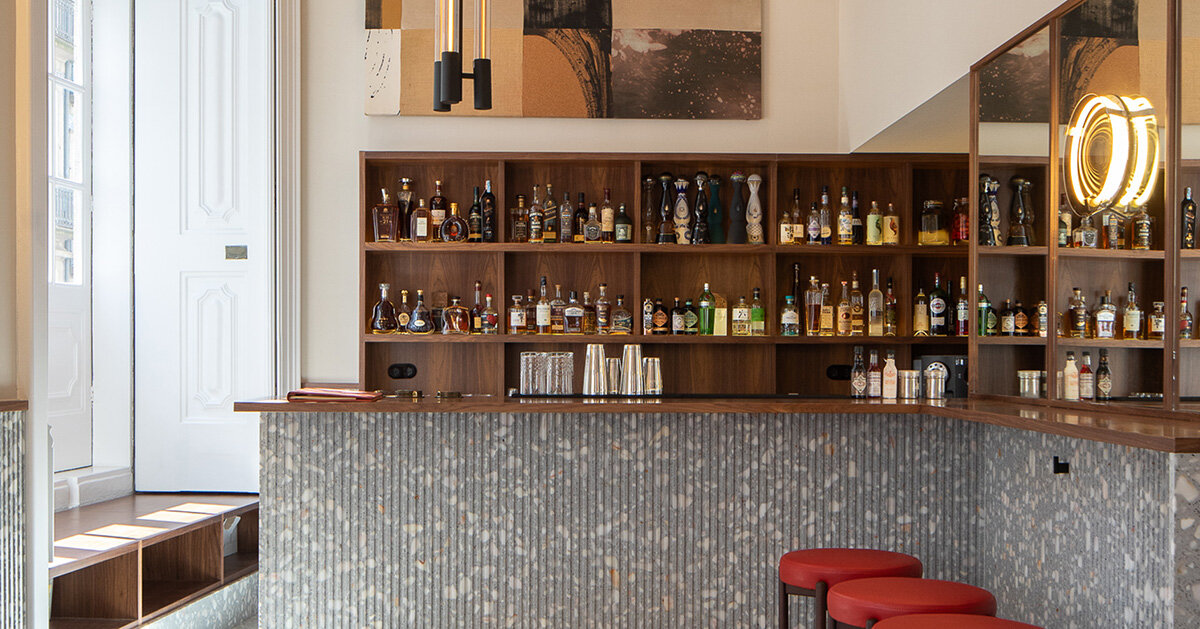 Estudio Sergio Rebello oso cambiar El chef de la DOP, Rui Paula, un veterano Comedor existir Oporto El centro de la ciudad es Patrimonio de la Humanidad por la UNESCO. Ubicado en el Palacio de las Artes, antigua sede del Banco de Portugal, el proyecto combina elementos de diseño contemporáneo con la rica historia del edificio, comenzando con su renovación. frente. Cuatro ventanas de doble altura, ahora enmarcadas por luces verticales hechas a medida, junto con un letrero de neón rojo, enfatizan la presencia del restaurante en la Plaza Lago de Santo Domingo.