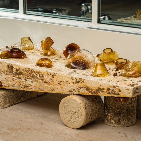 La pieza, titulada «Mesa efímera», consiste en una mezcla de un 50% de matriz de micelio y otros desechos orgánicos, incluidos papel y hojas.
