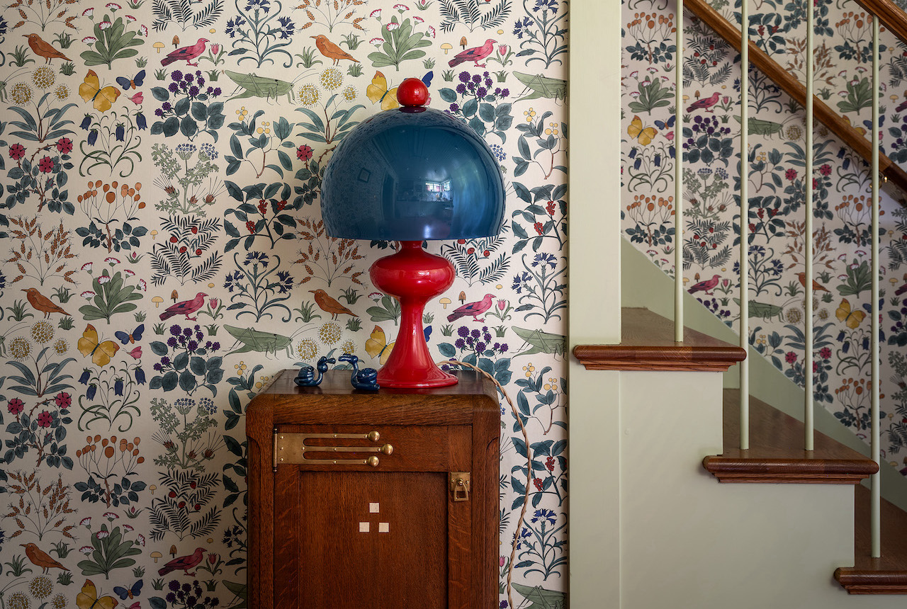 Escena interior con papel tapiz floral, armarios de madera con luces azules en la parte superior y escaleras con barandillas de madera.