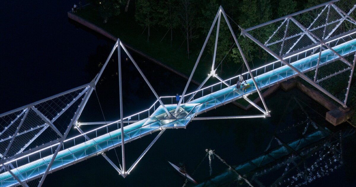La pirámide actúa como un ancla, conectada a tierra y sostenida por una red de cables sujetos. Con sede en Pekín El arquitecto conecta los cables desde el vértice superior hasta el extremo junto al agua, creando una tensión previa que suspende las dos pirámides sobre el agua. La cubierta tiene una luz de 50 metros y está fijada a ambos lados mediante soportes deslizantes, lo que hace que la estructura parezca ligera y estable. Ambos extremos del tablero del puente están fijados a ambas orillas mediante soportes deslizantes. Una estructura compuesta por cuatro pirámides triangulares sostiene un puente peatonal de vidrio de 80 metros de largo. Juntos crean un sistema estructural estable al tiempo que logran una ligereza visual.