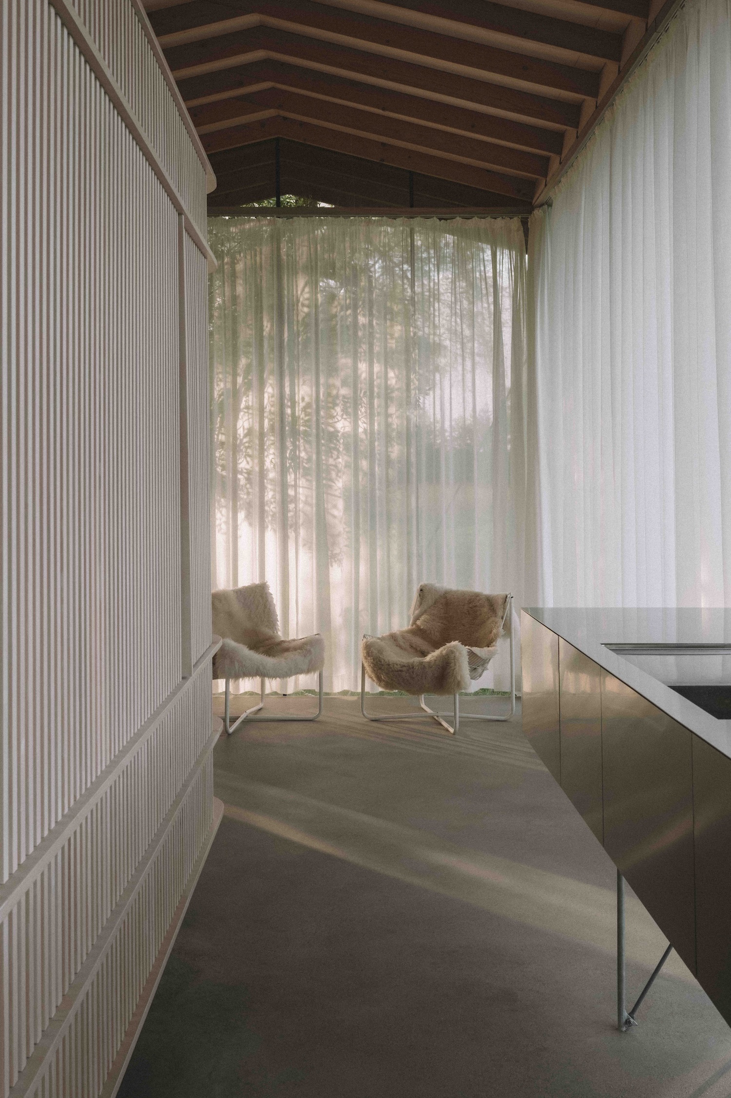 Una gran puerta corredera conduce a la sala principal, haciéndose eco de las proporciones de una casa comunal clásica, con unas dimensiones de 4 mx 10 m y una altura de techo de 4,1 m. El espacio combina formas rústicas tradicionales con las líneas limpias del modernismo. El interior está hábilmente dividido en tres áreas mediante enormes listones de madera que dividen el espacio sin cerrarlo por completo. La parte sur está bañada por la luz del sol durante todo el día y sirve como zona de comedor con una gran mesa independiente. Hacia el norte, la zona de estar está bañada por el sol del atardecer. En el centro, la cocina y la zona húmeda se integran en la estructura de madera, lo que ayuda a separar visualmente estas funciones del resto de la estancia. Dos cubos de madera (que albergan las áreas para dormir) están incrustados dentro de la plataforma de vidrio, brindando una sensación de privacidad en contraste con el plan abierto.
