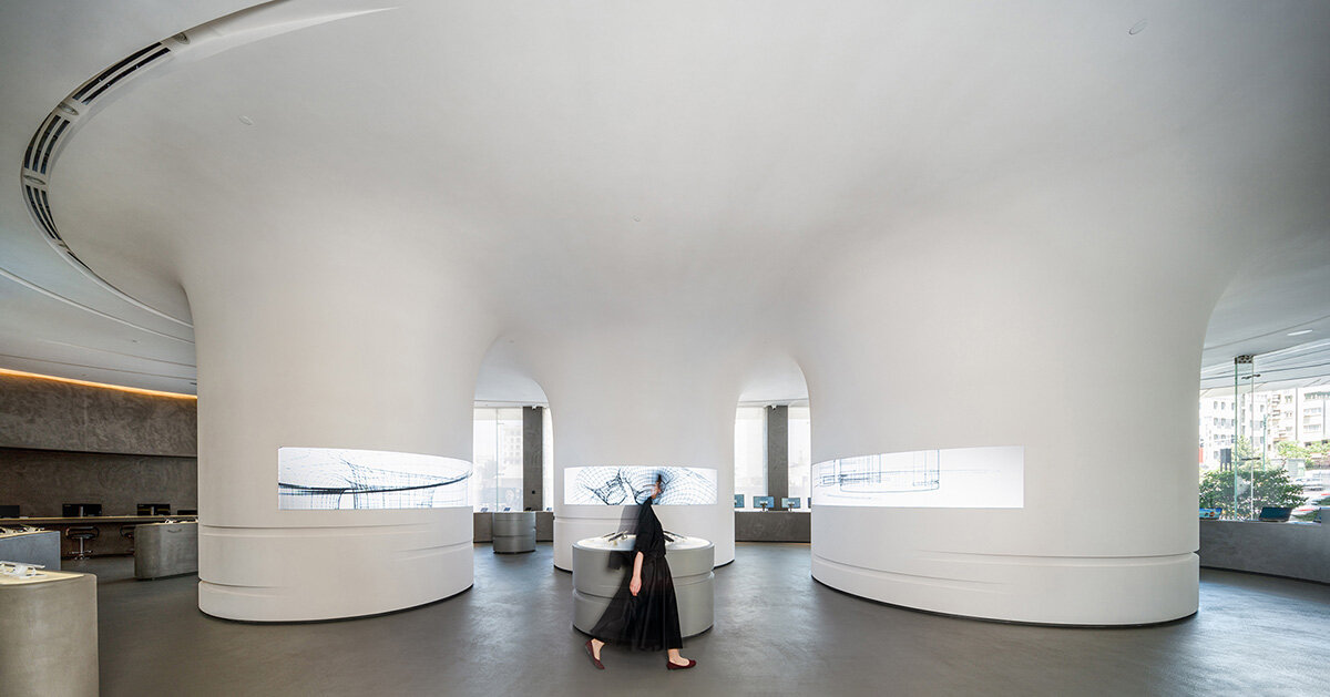 Los canales en espiral definen la forma cilíndrica del fluido interior de la tienda insignia de Digikala.