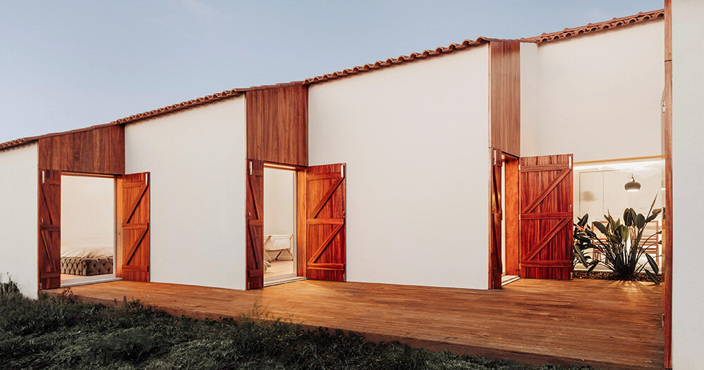 En contraste con el lado de la calle más cerrado, la parte orientada al sur de Casa no Meco diseñada por Fábio Ferreira Neves se abre gradualmente a un jardín privado. Las grandes ventanas están cubiertas por persianas exteriores de madera, lo que permite que la luz natural inunde la casa, conectando los espacios interiores con el exterior mientras se mantiene el control sobre la exposición al sol y la privacidad. La selección de materiales y los métodos de construcción de Casa no Meco respetan las tradiciones locales y se basan en imágenes arquitectónicas mediterráneas familiares. El uso de paredes encaladas y contraventanas de madera evoca la sensación vernácula de la zona, mientras que el techo inclinado mantiene una forma simple y reconocible que complementa la arquitectura del pueblo circundante.