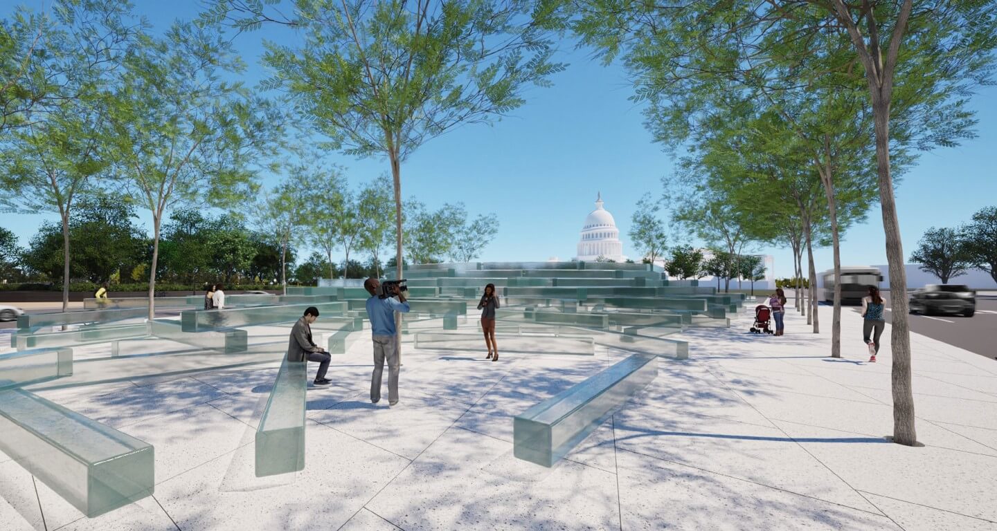 Las representaciones de John Ronan Architects muestran bloques de vidrio sólidos centro comercial nacional El edificio del Capitolio de los Estados Unidos se puede ver directamente desde el lugar. Los volúmenes están dispuestos de forma un tanto aleatoria y convergen en un espacio cilíndrico llamado Memorial Hall, que es la pieza central del monumento.