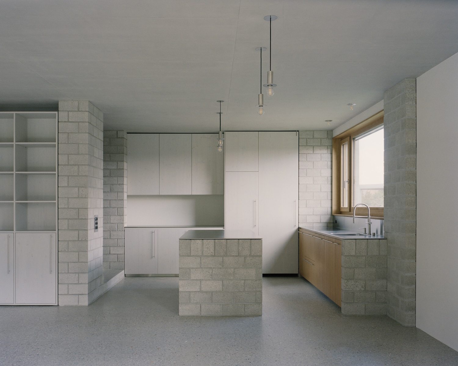 La construcción de la casa se inspiró en estructuras prácticas y utilitarias comunes en la zona, como graneros de ladrillo y cobertizos sencillos revestidos de metal. El diseño prioriza la funcionalidad, utilizando planos ortogonales y ventanas estratégicamente ubicadas para optimizar la luz. Los materiales se eligieron poniendo énfasis en la practicidad y la durabilidad: el hormigón forma la envolvente principal, asegurando la longevidad y la resistencia a la intemperie, mientras que los ladrillos de cemento definen las áreas climatizadas de la casa. Los métodos de construcción simples, con un número limitado de capas, enfatizan la eficiencia y la honestidad estructural. El uso de aislamiento mineral, combinado con pisos de concreto lijado y juntas huecas en el piso superior, refleja el compromiso del proyecto con la simplicidad y la verdad constructiva, haciéndose eco del espíritu rural de la zona.