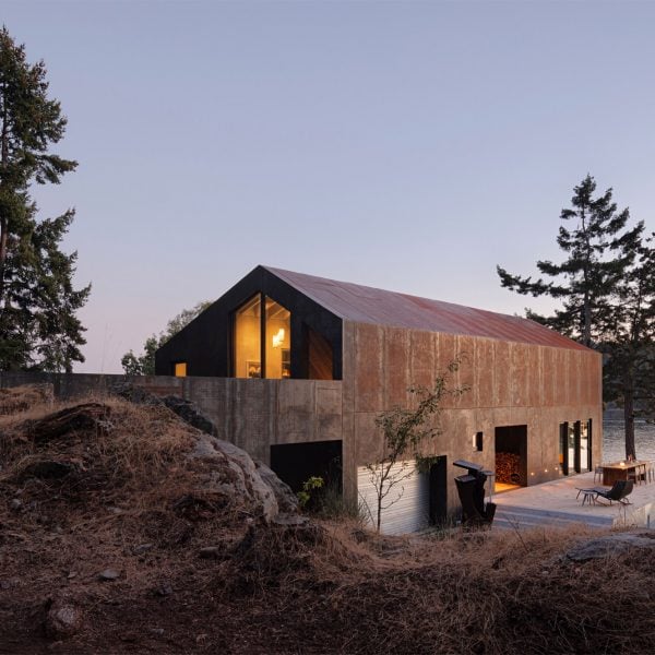 madera reciclada y Acero resistente a la intemperie ser utilizado en un columbia británica La isla pertenece a los fundadores de Measured Architecture, cuyo objetivo es explorar un «enfoque cero» en el diseño y la construcción.