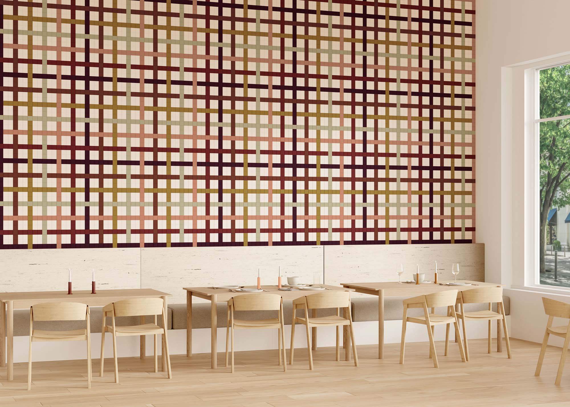 Creada en asociación con Artaic, esta aplicación de pared acústica utiliza baldosas de fieltro cuadradas en más de 90 colores para crear patrones grandes y pequeños.