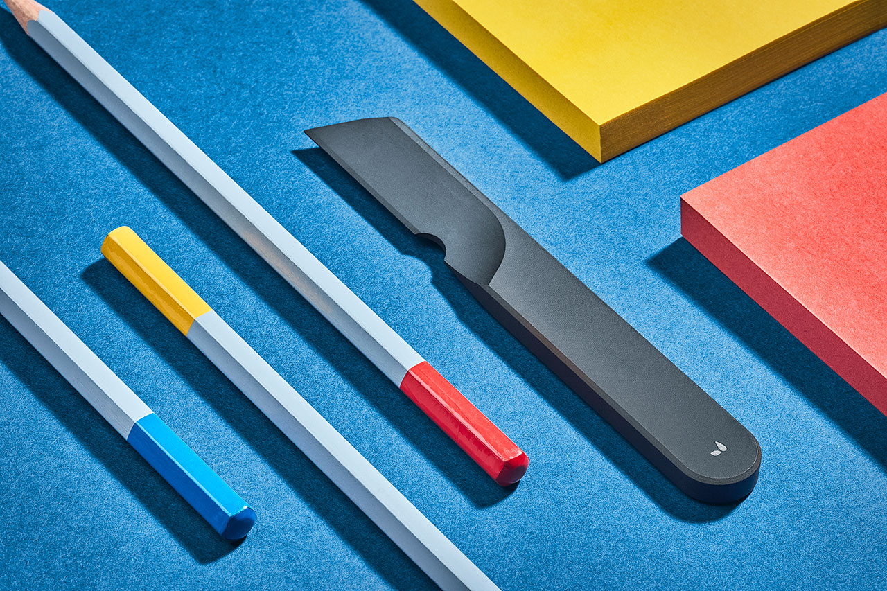 Suministros de escritorio variados que incluyen dos lápices de colores, una navaja Grovemade y notas adhesivas amarillas y rojas sobre una superficie azul.