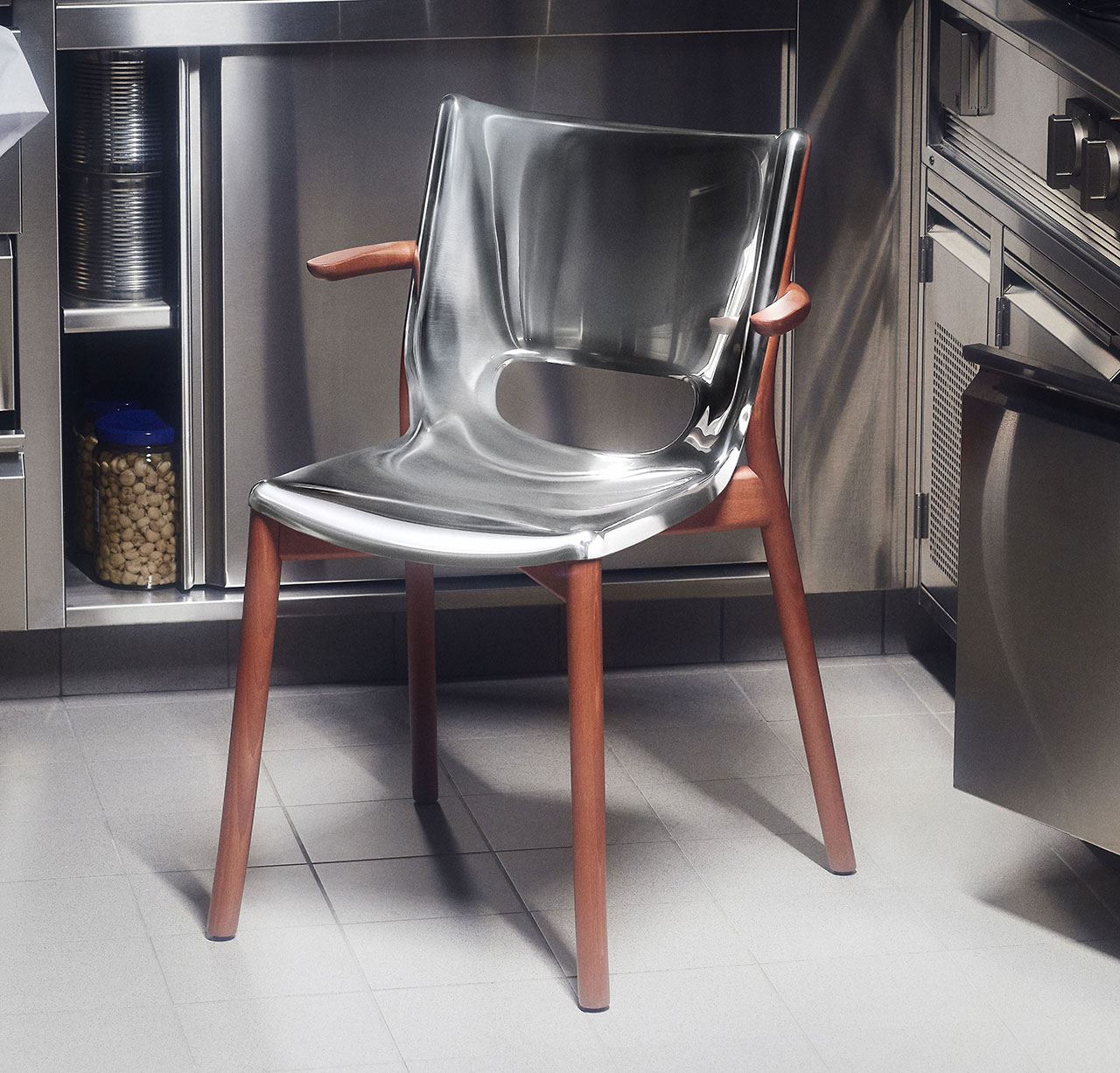 Fabricada en acero inoxidable 18/10 pulido espejo y madera de haya teñida de marrón, la colección es lujosa pero familiar. Los elementos de metal fundido se adaptan y relajan formando patas aparentemente más resistentes, dando la ilusión de una envoltura de plástico o un vidrio que se mueve lentamente. La calidad culinaria también se refleja en los detalles, con herrajes visibles y resistentes. Los remaches dobles y la curvatura uniforme que tendrá cualquier olla de acero de alta calidad, esta serie no es diferente.