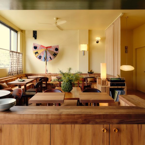 En otra parte, la cafetería está iluminada por una serie de faroles de papel de arroz y apliques de pared antiguos, acentuados por un aplique angular. Olivia Bossi.