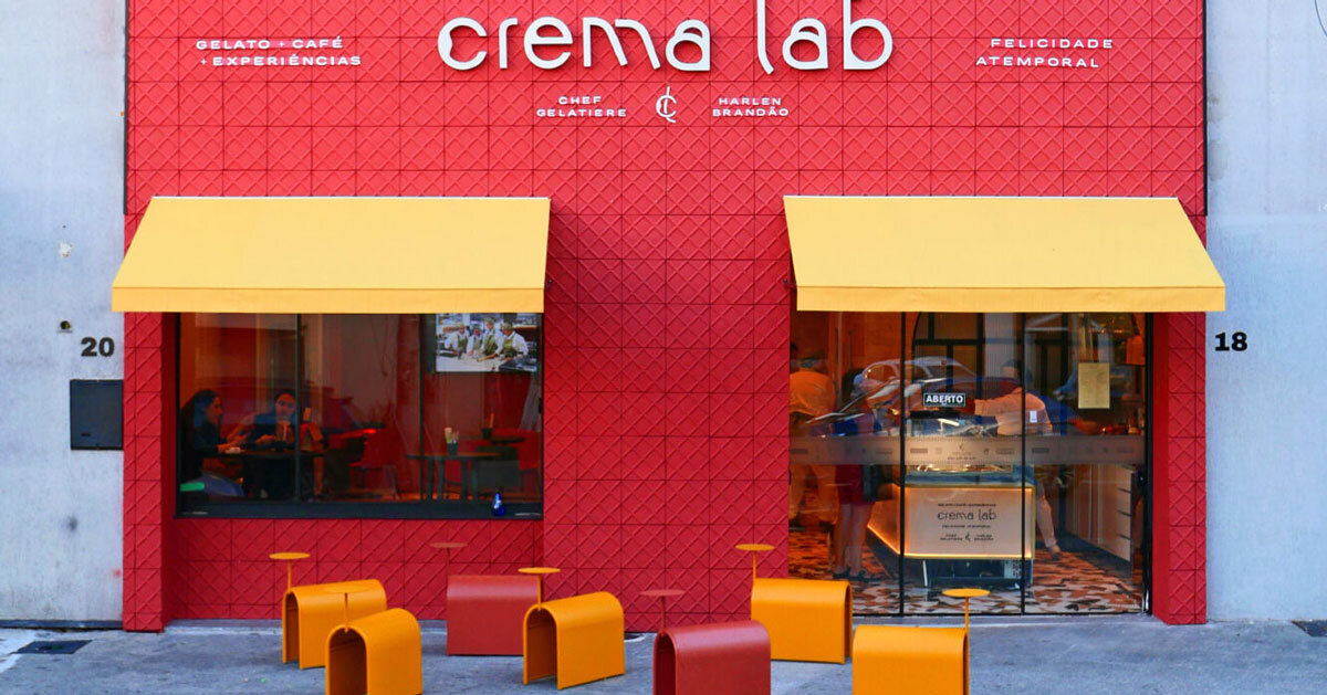 Crema Lab | Gelato + Café + Experiences, fundado por el chef heladero Harlen Tessari Brandão, ofrece un espacio de última generación donde el helado se elabora in situ para cumplir con altos estándares de calidad e innovación. pelo estudio de diseñoSu aportación no se limita al exterior, sino que también incorpora diseños de mobiliario híbrido como el banco «Cavalinho». Con dos posiciones para sentarse y una mesa auxiliar integrada, estos productos versátiles combinan una construcción metálica resistente con un diseño ergonómico. Las formas divertidas recuerdan a criaturas abstractas y añaden una sensación caprichosa al interior de la cafetería.