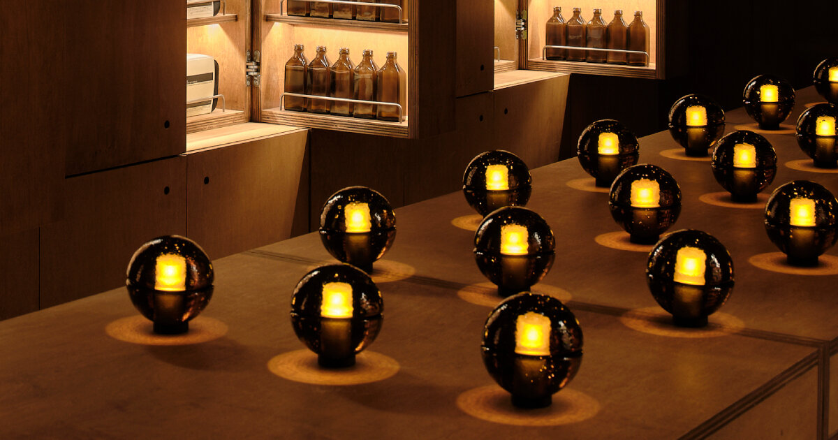 Bocci trae mesa de velas portátil Luz Serie, 14p, a Esopo Espacios en Gansevoort y Rockefeller Center en Nueva York y Gastown en Vancouver, Canadá. una serie de lámparas de mesa recargables y completamente inalámbricas suspendidas del techo o colocadas sobre encimeras, ambas iluminando su entorno diseño de interiores minoristas marca de cosméticos. Estas lámparas de mesa de vidrio constan de dos hemisferios endurecidos con vidrio fundido. Sus bordes imprecisos están salpicados de burbujas de aire, lo que sugiere el trabajo de los sopladores de vidrio mientras llenan manualmente vidrio licuado en moldes.