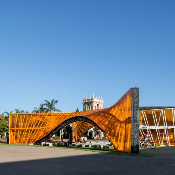 El estudio de diseño local Heleo y el artista tijuanense Daniel Ruanova crearon un pabellón existir san diego Diseñados para simbolizar la frontera entre Estados Unidos y México, los muros se entrelazan para formar un espacio de reunión.