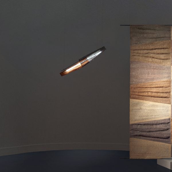 Selbak también diseñó la lámpara colgante Nafaq para la colección, que tiene una forma similar pero cuelga horizontalmente.
