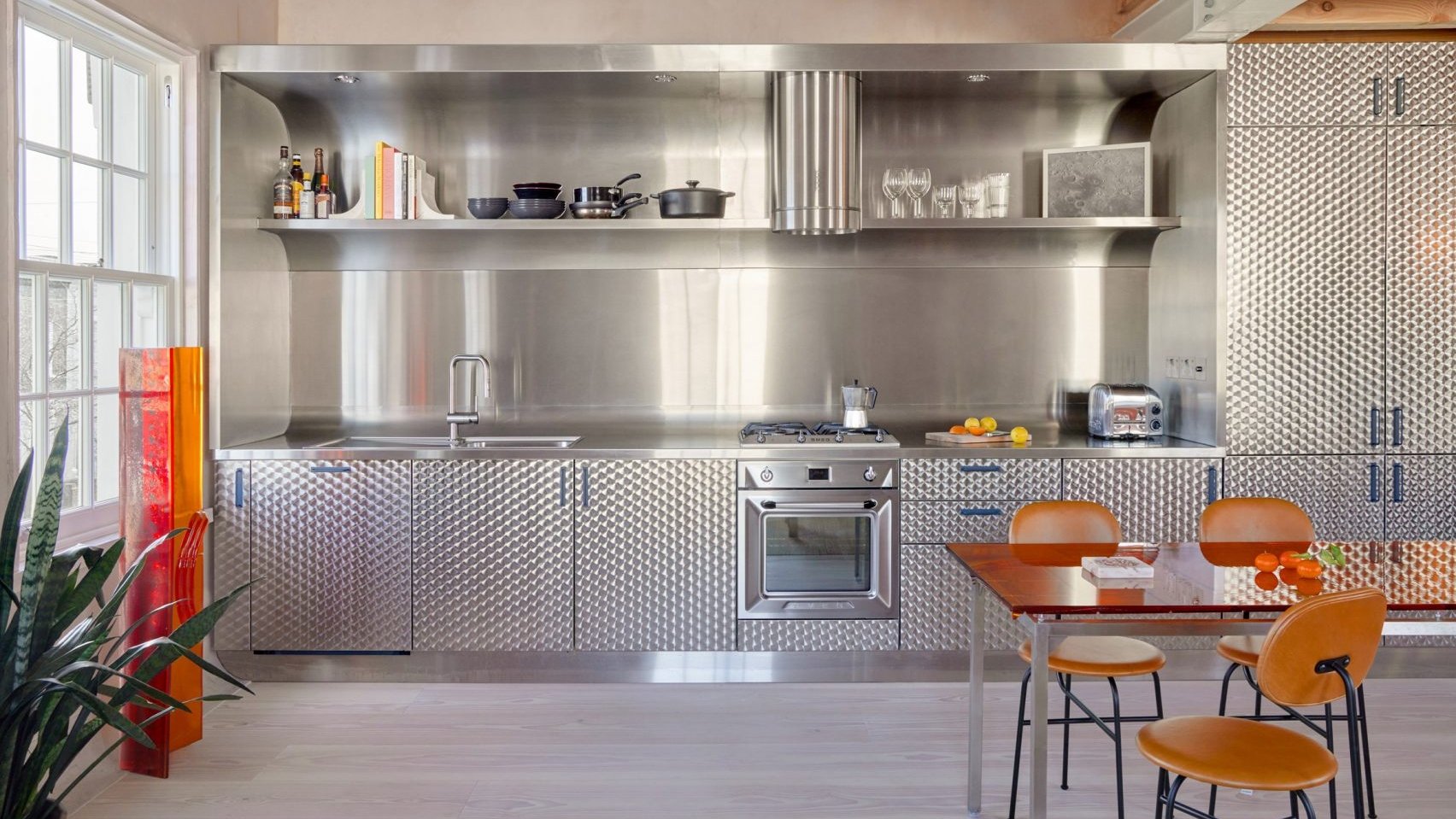 Las encimeras de cuña inclinadas tanto en la cocina como en el comedor tienen un acabado en aluminio en bruto horizontal, diseñadas para combinar los dos espacios a la perfección.