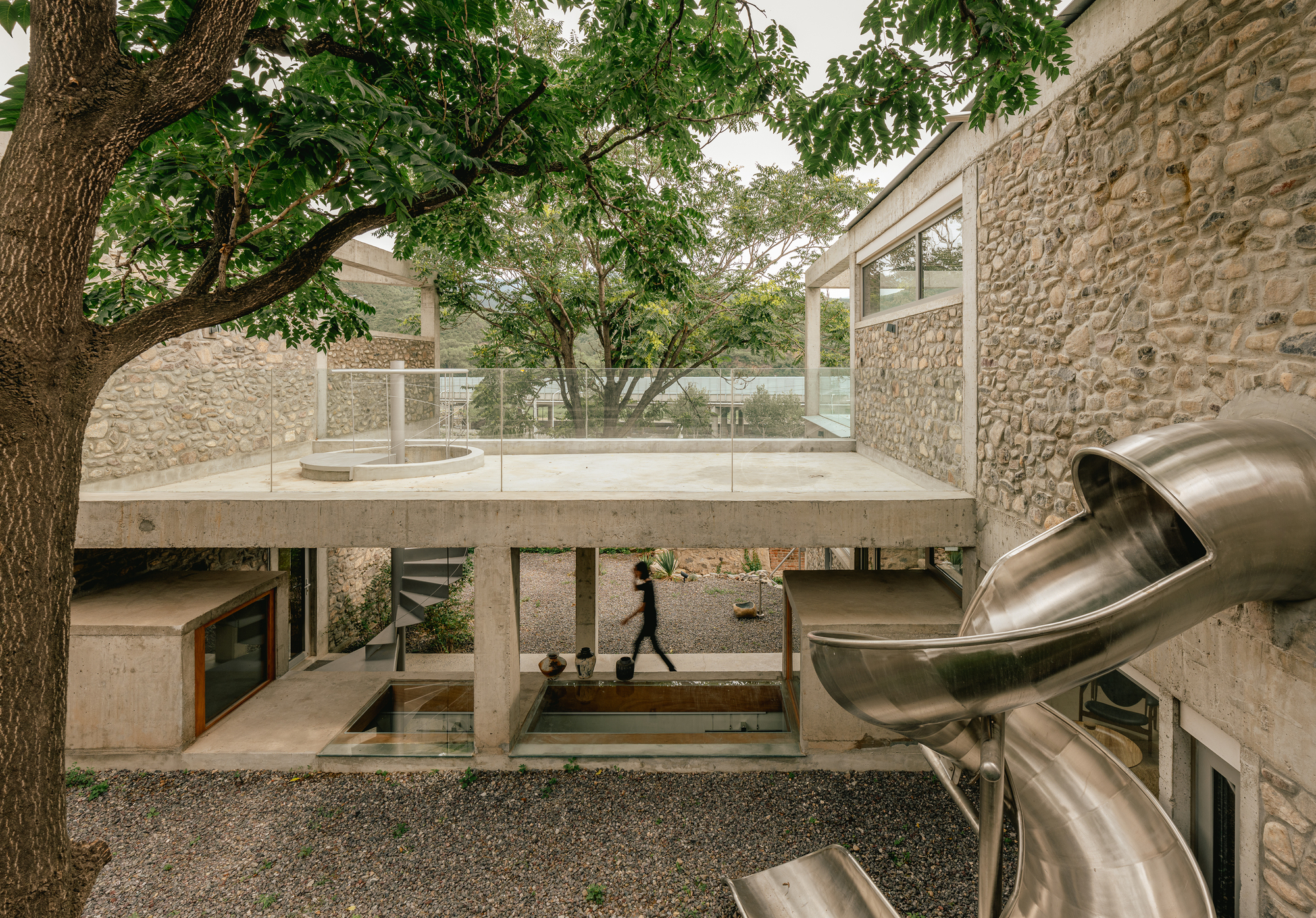 En general, House of Bluff incorpora formas geométricas simples y pone orden en un sitio previamente caótico, muy parecido a esta pintura. fuente de la juventud. Externamente, la fachada expuesta del edificio combina un marco de concreto con relleno de piedra, mientras que internamente, las paredes están revestidas con estuco de tonos cálidos y el marco estructural que sobresale está revestido con paneles de madera. Esta interacción intencional de dos materiales no solo crea un sorprendente contraste visual, sino que también sugiere una yuxtaposición binaria de sistemas estructurales y de mantenimiento, enriqueciendo su narrativa arquitectónica.