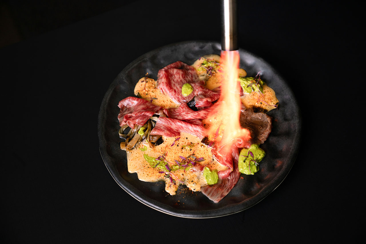 Carpaccio de ternera Wagyu\\\ Flores de perilla, ternera Wagyu grado 5, eneldo, aceitunas, pimientos rojos y amarillos\\\ Foto: juegos espaciales