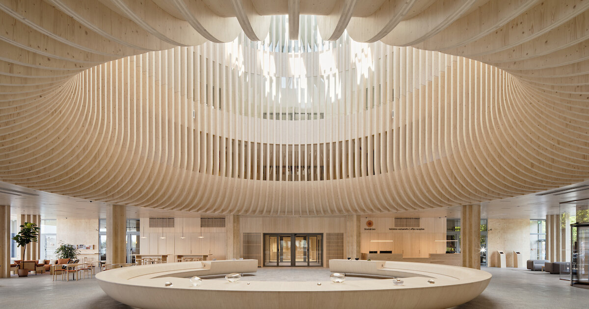 Katajanokan Laituri de Anttinen Oiva Architects es el último ejemplo Finlandianueva generación y grandes madera designboom realizó un extenso recorrido por el edificio durante este período semana del diseño de helsinki. Este llamativo edificio es la sede de la empresa forestal finlandesa Stora Enso y Pier 4 hotel Tiene 164 habitaciones incluyendo Cafés y restaurantes Instalaciones abiertas al público y oficinas adecuadas para una variedad de negocios. Este último hito, que ahora forma parte del horizonte marítimo de Helsinki y de la histórica Plaza del Mercado, también albergará el nuevo Museo de Arquitectura y Diseño y pronto se convertirá en un punto de encuentro para el arte, el diseño y el ocio. ‘La zona está experimentando una transformación espectacular, con la reubicación parcial de las antiguas funciones portuarias y la apertura gradual de la costa a los peatones.,’ Comparte el arquitecto.