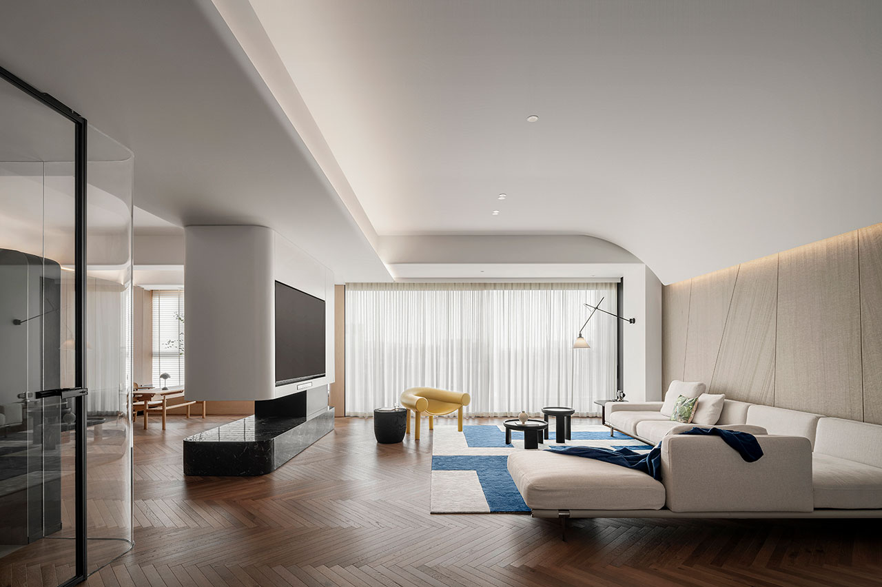 Ubicado a orillas del lago Green Island, ciudad de Foshan, provincia de Guangdong, China. residencia sin findiseñador DDque encarna la filosofía de «limitado pero infinito». El diseño se esfuerza por integrar la tranquilidad de la naturaleza con espacios modernos para crear un ambiente que sea físicamente cómodo y mentalmente rejuvenecedor. En lugar de adherirse a los estrictos límites de una casa tradicional, c.dd adopta un diseño fluido y abierto que permite un flujo ininterrumpido entre diferentes espacios. El diseño elimina las barreras físicas, asegurando que cada área (desde la entrada hasta la sala de estar, el comedor, la cocina y el estudio) se combine perfectamente con la siguiente. Este diseño abierto transforma la casa de un espacio estático a un entorno dinámico y en constante cambio, que refleja la fluidez de la vida misma.