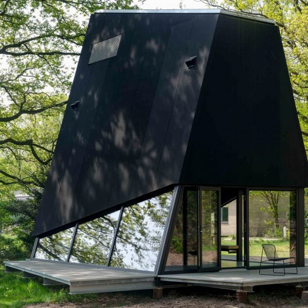 El perfil negro mate angular del avión furtivo define la apariencia del avión. casa de vacaciones en antigua base militar Países Bajosrealizado por el estudio local Sander van Schaik.