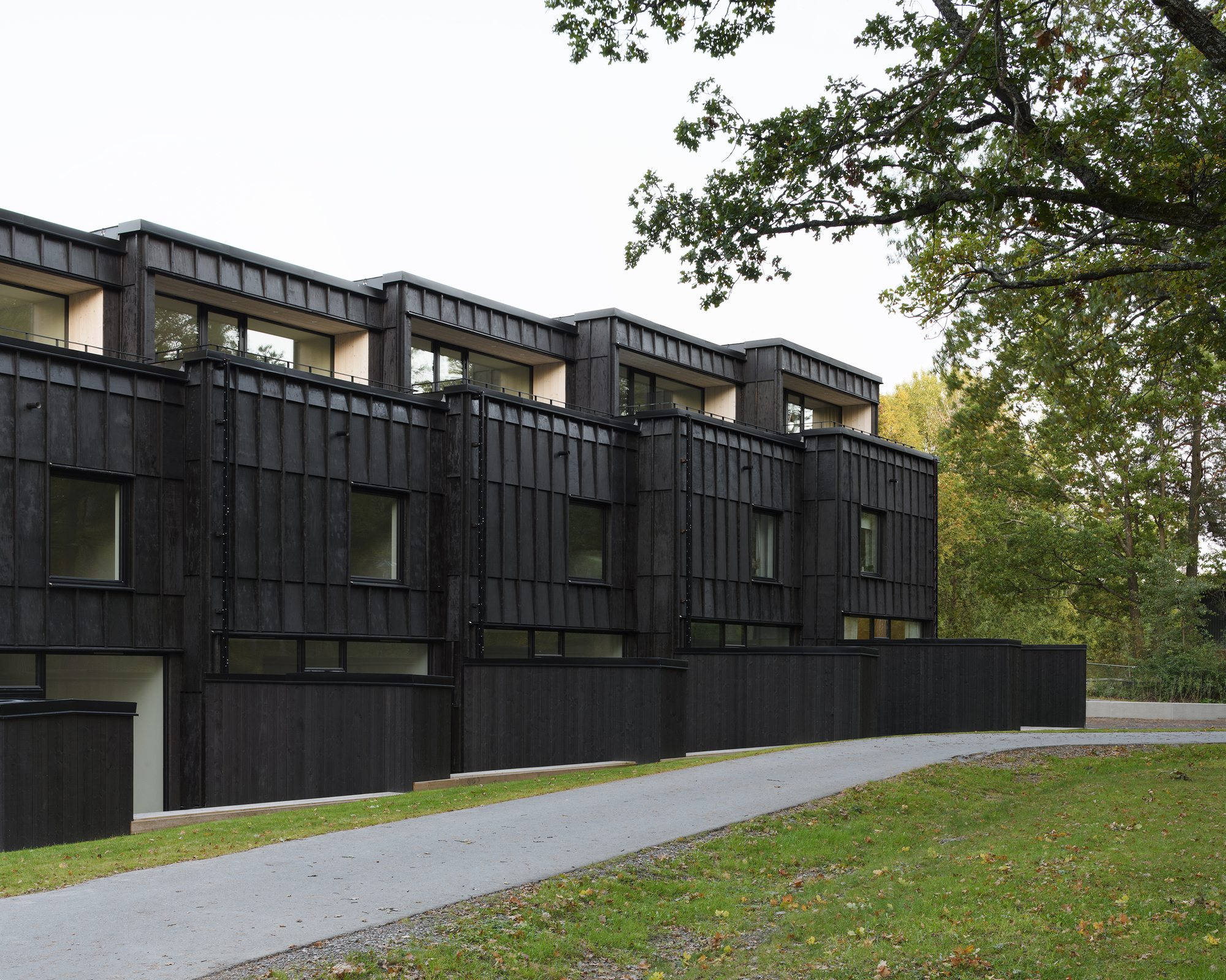 Descripción textual proporcionada por el arquitecto. Como muchos suburbios de Estocolmo, la parte de Skendaal donde se encuentran quince casas adosadas está rodeada de naturaleza. Quince casas están situadas en un entorno similar a un parque, rodeadas de robles, campos y bosques de coníferas. Se disponen en dos filas, siguiendo ligeros cambios del terreno tanto en altura como lateralmente.