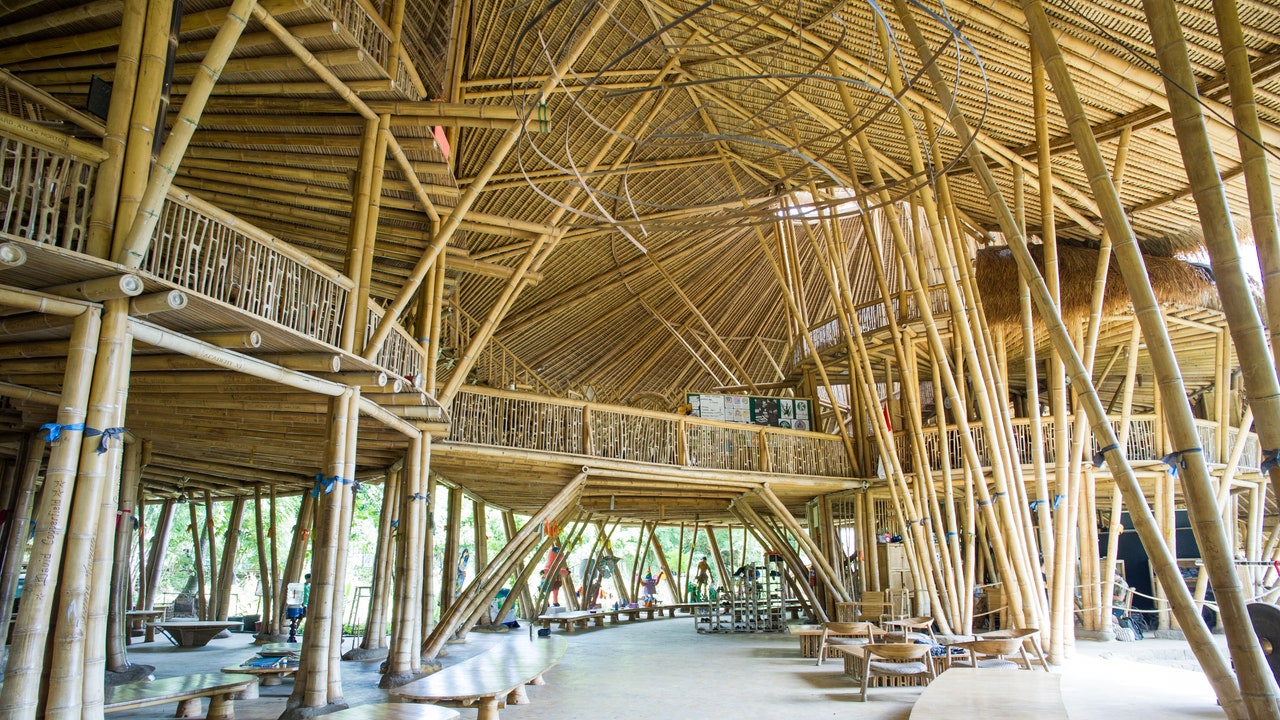 Uno de los edificios más llamativos del campus de Green School es el Edificio Curvo, diseñado con una serie de arcos esqueléticos hechos de bambú de origen local, que se utiliza como gimnasio y espacio de reunión.