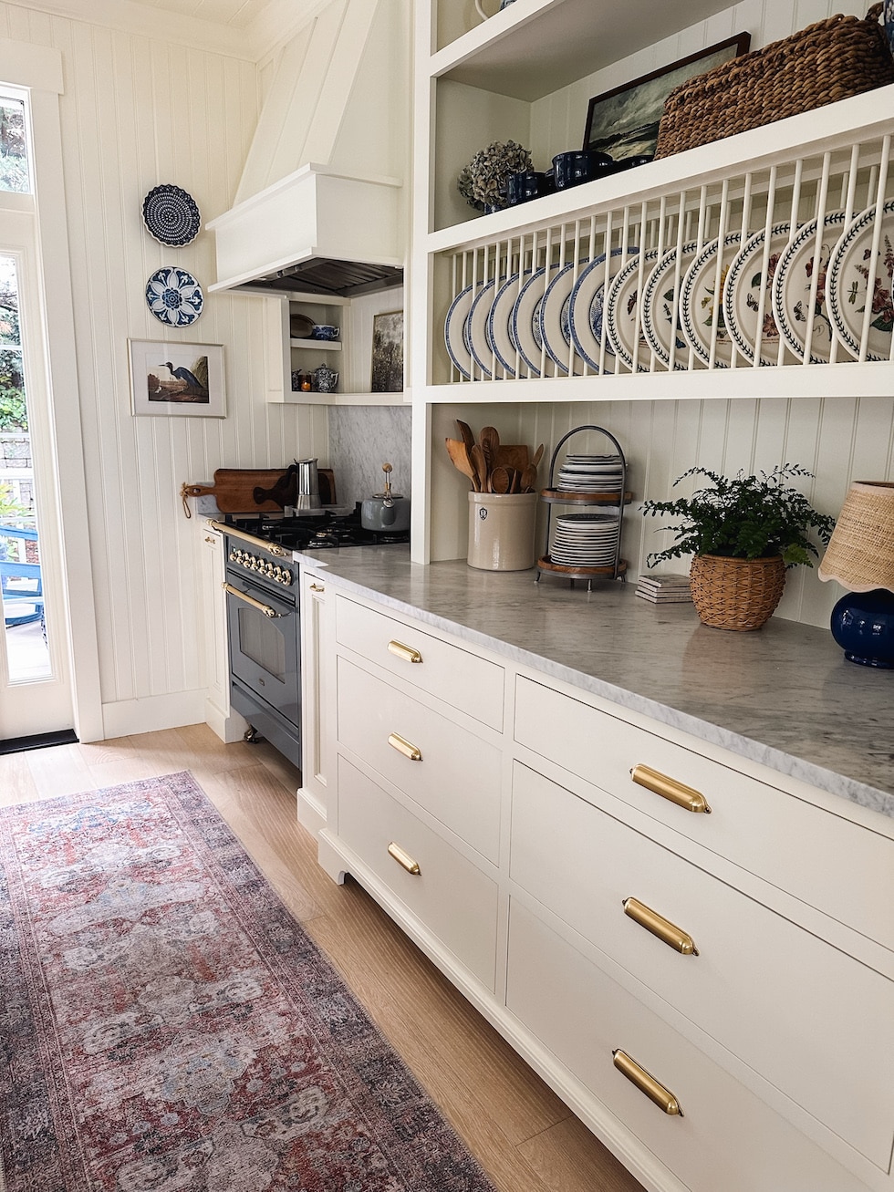 Una cocina no tiene por qué ser un espacio utilitario frío o austero. Calienta tu habitación con accesorios más acogedores que añaden carácter y calidez textural a la habitación. Piensa en la obra de arte (mi arte costero favorito). aquí), cestalibro de cocina (mi hermoso libro favorito aquí), jarrones, cortinas de café (tengo Hay uno en mi ventanay tTiene uno en la esquina del taburete de mi isla.) tablas, utensilios, etc.