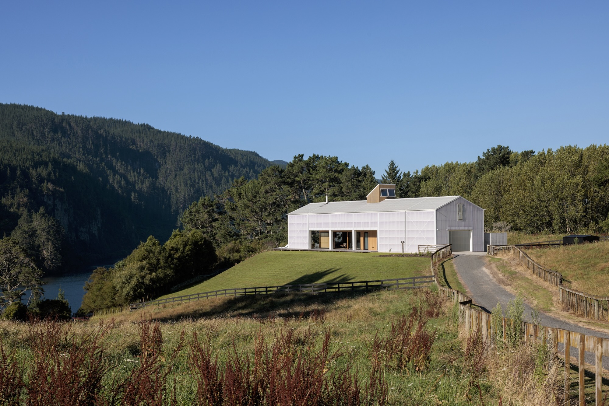 Descripción textual proporcionada por el arquitecto. The Chodge es una casa rural de vacaciones en Nueva Zelanda rodeada de un hermoso paisaje natural. La casa es una exploración del espacio intersticial entre interior y exterior. Es una fascinación navideña «kiwi» que abarca la vida interior y exterior. El movimiento clave es la separación exagerada de los espacios interiores, que están altamente aislados, parecen cuevas y están sombreados por la estructura exterior más grande, que brilla a través de grandes aberturas operables.