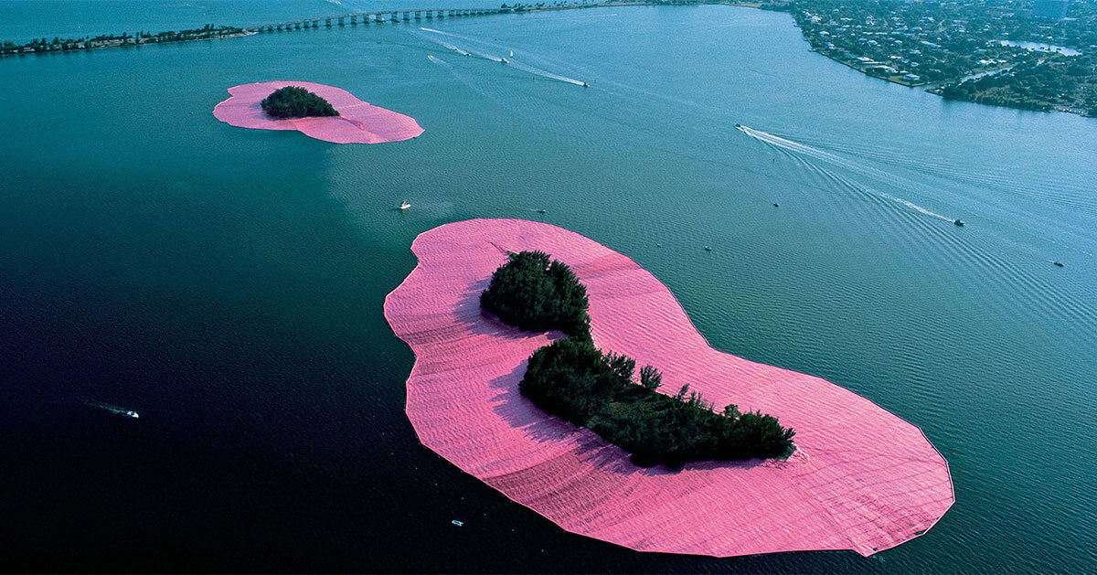 Around the Islands de Christo y Jeanne-Claude nació en mayo de 1983, cuando 6,5 millones de pies cuadrados de tela de polipropileno rosa brillante envolvieron 11 islas en la Bahía de Biscayne. Aunque la instalación duró sólo dos semanas, la planificación tomó más de tres años y costó más de 3 millones de dólares, todo financiado por dúo artístico Vendiendo las obras originales de Christo. El concepto comenzó en 1980 cuando fueron invitados a crear una obra de arte para el Festival de las Artes del Nuevo Mundo de 1982. Durante los siguientes tres años, atravesaron un complejo proceso de aprobación y recibieron permiso de múltiples agencias, incluido el gobernador de Florida, la Comisión del Condado de Dade y el Cuerpo de Ingenieros del Ejército de EE. UU. También trabajan en estrecha colaboración con grupos ambientalistas y residentes locales para proteger la vida silvestre marina alrededor de las islas. A excepción del material documental conservado para la colección, todos los materiales utilizados en las islas circundantes fueron reciclados industrialmente. Aunque «La Isla Rodeada» estuvo instalada sólo durante dos semanas, dejó una huella imborrable en la historia del sur de Florida.