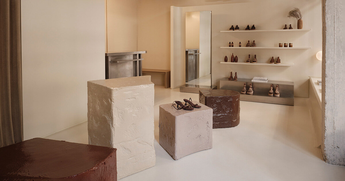Exarcheia, situada en el centro de Atenas, GreciaDiseñada por la arquitecta de interiores Nancy Katri, la tienda insignia de Esiot encarna la esencia del cuero. Inspiradas en los materiales clave de las sandalias hechas a mano localmente de la marca. zapatoeste almacenar Hay una dualidad en el diseño que refleja los productos y los procesos artesanales detrás de ellos. Esta dualidad formó y se convirtió en el concepto de diseño principal, dividiendo el espacio en áreas frontal y detrás del escenario. La recepción presenta tonos tierra cálidos, suaves y satinados, como terracota, marrón oscuro, naranja quemado y marfil, creando una atmósfera acogedora que resuena con la imagen de la marca. uno cayó específico Los pisos añaden una textura sólida, complementada con unidades de espuma de poliestireno esculpidas a medida que sirven como asientos y podios flexibles, reflejando la naturaleza dinámica del entorno minorista.