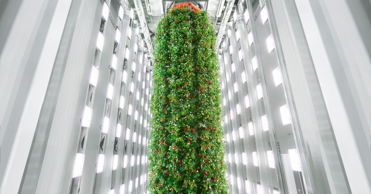 Hay torres de 30 pies de altura dentro de la granja vertical para cultivar frutas. Hasta ahora, solo se cultivará la variedad de fresas Driscoll utilizando la tecnología de Plenty y la genética avanzada de Driscoll, y las primeras fresas de la granja vertical llegarán al mercado a principios de 2025.