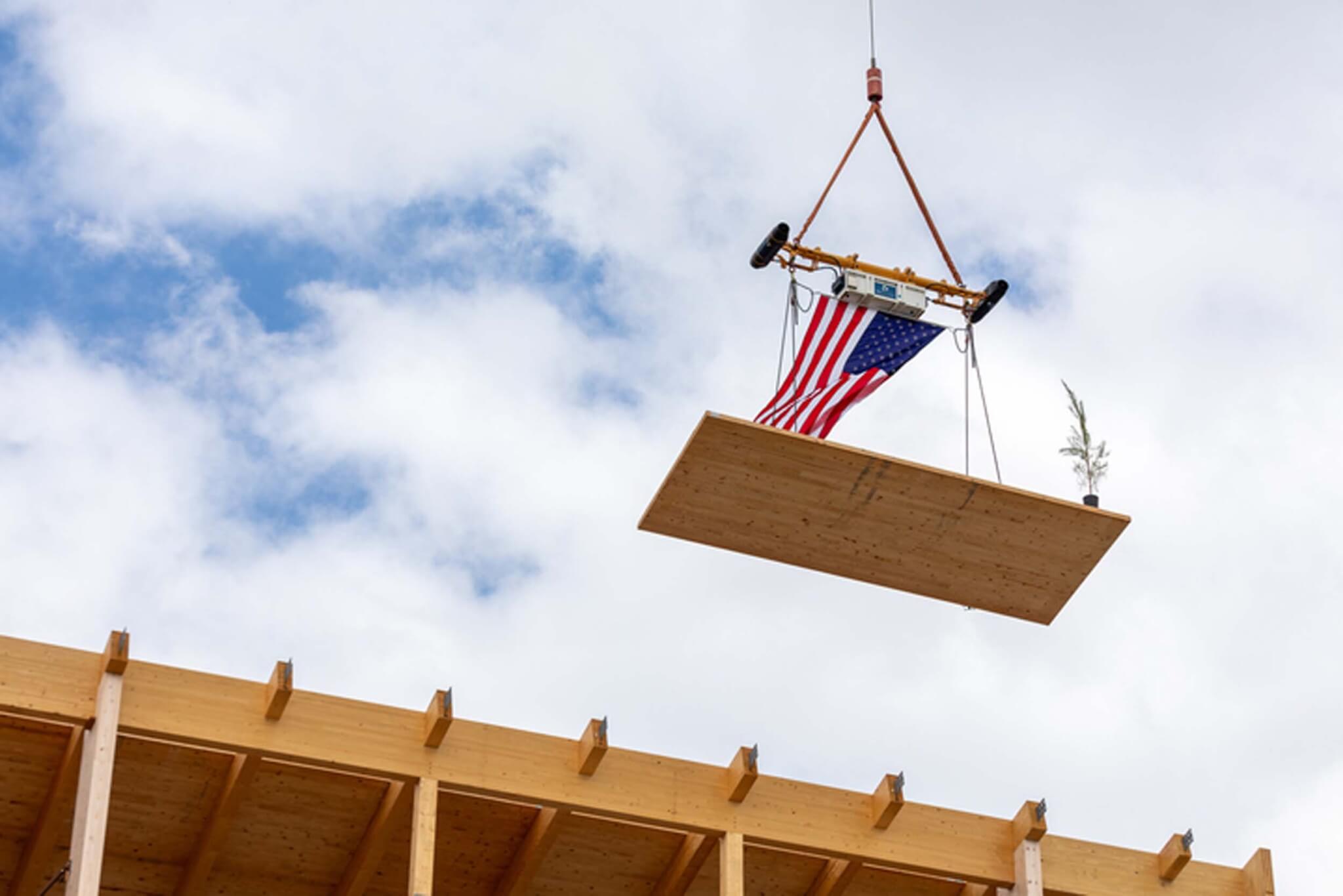 Hospedarse El trabajo va sin problemas Grafton Arquitectos– Diseñó el Centro de Innovación de Diseño y Materiales de la Universidad Anthony Timberlands. Arkansas. La semana pasada, 120 personas se reunieron en el evento. de madera Observe la ceremonia de «remate», una ceremonia que reconoce la ubicación del punto más alto de la estructura (una losa de planos de techo en cascada).