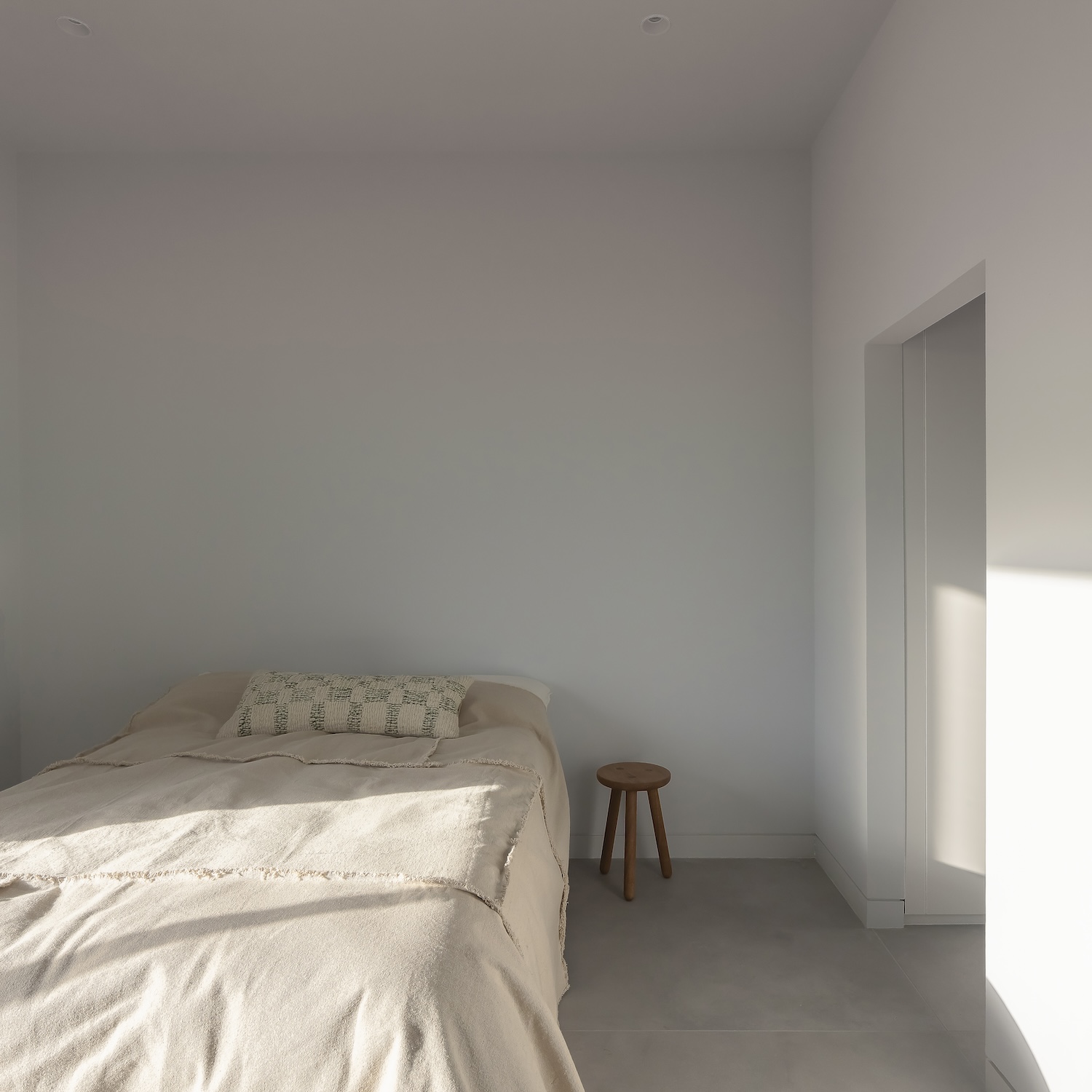 La fachada orientada al sur está protegida de la vista del público y cuenta con un acristalamiento de altura completa que se abre hacia el césped, lo que permite que la luz natural llene la casa manteniendo la privacidad. Las ventanas y los tragaluces están estratégicamente ubicados para enmarcar las vistas del paisaje y crear efectos de iluminación dinámicos durante todo el día. En el interior, la paleta de materiales enfatiza la calma y la sencillez. Los azulejos de color gris claro y las paredes pintadas de tiza crean un fondo neutro, permitiendo que la vegetación circundante ocupe un lugar central. La sala de estar de planta abierta cuenta con paredes acristaladas que conectan directamente con el exterior, con aleros profundos que crean una terraza protegida. La distribución de la casa sigue una planta en forma de L.
